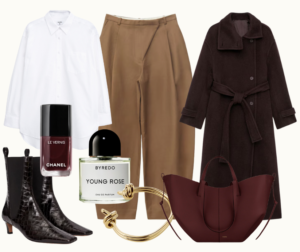 Byxor, And Other stories. Skjorta, Filippa K. Rock, Arket. Nagellack, ”Rouge Noir”, Chanel. Doft, ”Young Rose”, Byredo. Armband, Svenskt tenn. Väska, Polène.